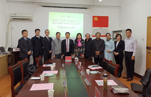 2018年12月19日,歐蒙亞太集團總裁李川先生一行走進安徽醫科大學,筑夢學子,與安徽醫科大學簽署“歐蒙助學金”暨教學支持合作協議。安醫大教育基金會秘書長許柏松,校學生處副處長吳熱生,第一臨床醫學院黨委副書記、學生黨總支書記楊秀蘭,檢驗系主任徐元宏,學生黨總支副書記薛磊等相關負責人出席儀式。