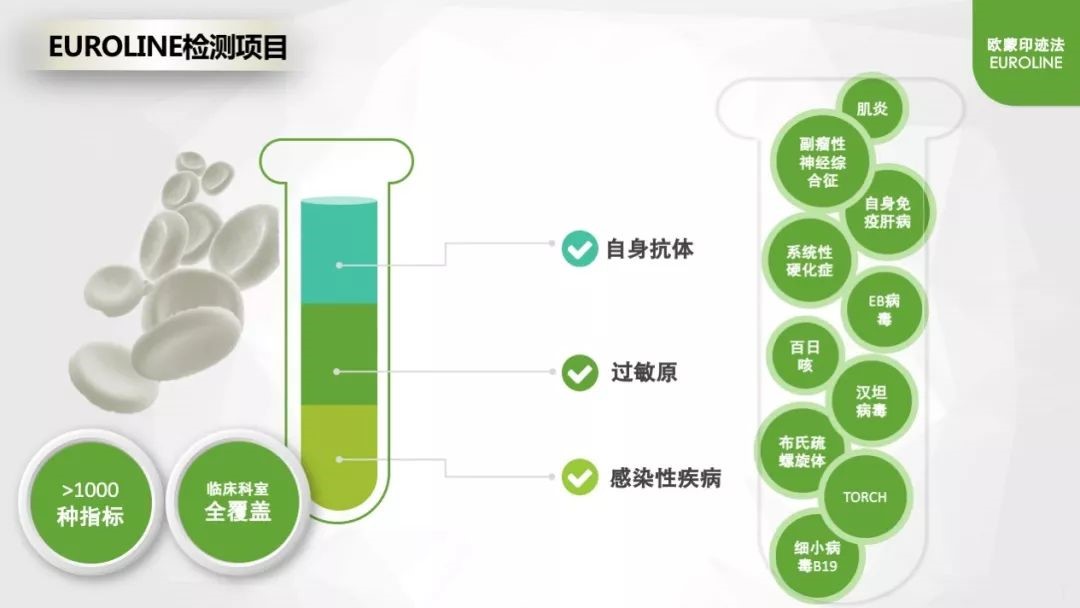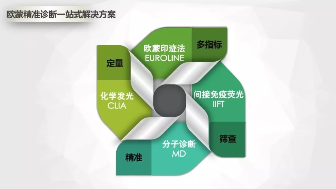 “歐蒙精準診斷一站式解決方案”由間接免疫熒光(IIFT)、歐蒙印跡法(EUROLINE)、化學發光(CLIA)、分子診斷(MD)四大診斷技術方法學平臺構成,涉及高通量樣本檢測、多指標疾病篩查與確認、定量監測病情、精準診療不同階段的多元化檢測需求,貫穿診斷與鑒別診斷、療效判斷、預后評估等疾病診療全過程。