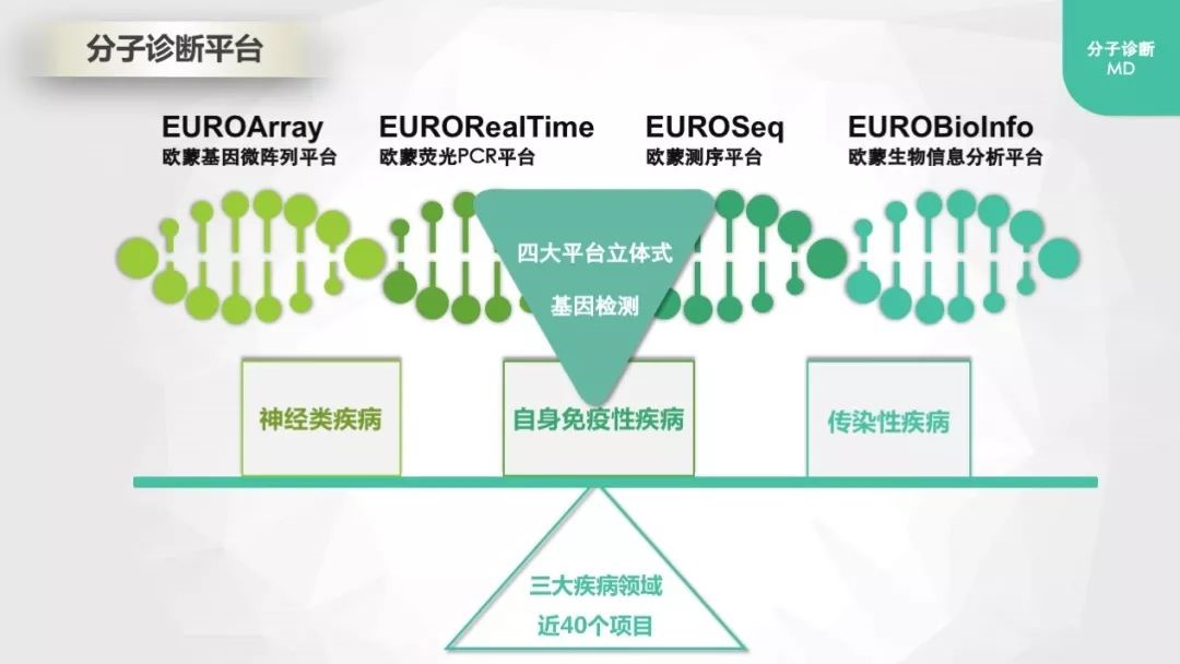 歐蒙不僅在自身免疫領域占據全球領先地位,在分子診斷技術方面也具有長遠的戰略眼光與穩固的技術根基。早在十年前,歐蒙就已開啟分子診斷技術探索之旅。截至目前,歐蒙公司在分子診斷領域已成功推出了EUROArray 基因微陣列、EURORealTime 熒光PCR、EUROSeq 測序、EUROBioInfo生物信息分析四大分子檢測平臺,檢測項目覆蓋自身免疫性疾病、藥物代謝與耐藥、傳染病多個領域的近40個項目。結合歐蒙原有免疫領域優勢,獨創“免疫+基因”全面診斷解決方案,為疾病的診斷提供更加精準、深度的疾病遺傳學技術支持。