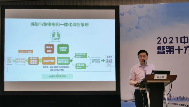 一直以來(lái),間質(zhì)性肺疾病(ILD)的診治都是呼吸科醫(yī)師常常需要面對(duì)的棘手難題。程主任首先以幾個(gè)生動(dòng)病例為切入點(diǎn),向與會(huì)聽眾介紹了間質(zhì)性肺疾病的一般分類、臨床特點(diǎn)、診斷路徑和影像學(xué)表現(xiàn),并分享了自己在診治間質(zhì)性肺疾病的個(gè)人經(jīng)驗(yàn),如獨(dú)特皮疹的指向性和超薄CT的診斷價(jià)值。隨后,程主任從免疫學(xué)檢測(cè)和病原學(xué)檢測(cè)兩個(gè)角度,詳細(xì)介紹了間質(zhì)性肺疾病的一體化臨床診斷。