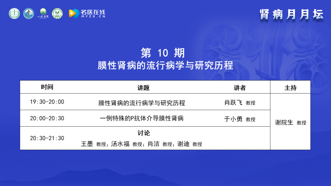 眾所周知,腎臟病患病率很高,特別是膜性腎病,在很多單位的腎活檢比例中占據(jù)首位。膜性腎病的無創(chuàng)診斷和治療手段日新月異,而且膜性腎病的異質(zhì)性很大,很多膜性腎病的病理表現(xiàn)大同小異,但是致病原因卻不一致,診療手段應(yīng)對應(yīng)病因?;诖吮尘?,“腎病月月壇”自2022年5月17日開始舉辦,在每個(gè)月的第三周的周二晚上,每月一期,每期一個(gè)主題,已經(jīng)舉辦了9期,包括”激素和免疫抑制劑在膜性腎病的合理應(yīng)用”、“利妥昔單抗在膜性腎病的合理應(yīng)用”、“原發(fā)性和繼發(fā)性膜性腎病的鑒別”、“中醫(yī)對膜性腎病的認(rèn)識(shí)”、“膜性腎病的抗原分類及發(fā)病機(jī)制”、“膜性腎病的臨床表現(xiàn)、無創(chuàng)診斷和病理診斷”、“膜性腎病的自發(fā)緩解和非免疫抑制治療”、“非典型膜性腎病的病理表現(xiàn)及鑒別診斷思路”、“膜性腎病與腫瘤”。本期是“腎病月月壇”的第10期,主題是“膜性腎病的流行病學(xué)與研究歷程”,通過對膜性腎病不同的專題進(jìn)行深入探討,希望大家對膜性腎病有更深的認(rèn)識(shí)。膜性腎病近幾年在診斷方面有跨時(shí)代進(jìn)步,特別是非創(chuàng)傷性的檢測磷脂酶A2受體,對疾病的診斷、預(yù)后判斷、治療選擇上都非常有幫助。還有膜性腎病各種新的治療手段,包括單克隆抗體在膜性腎病中的應(yīng)用進(jìn)展也日新月異。針對這些問題,本期特舉辦膜性腎病的流行病學(xué)與研究歷程的專題學(xué)術(shù)活動(dòng),邀請的講者和點(diǎn)評(píng)、討論嘉賓都是業(yè)內(nèi)非常著名的臨床專家、研究生導(dǎo)師、腎內(nèi)科主任,具有豐富的臨床、教學(xué)和科研經(jīng)驗(yàn),相信他們的分享一定會(huì)對大家的臨床診療有所幫助。