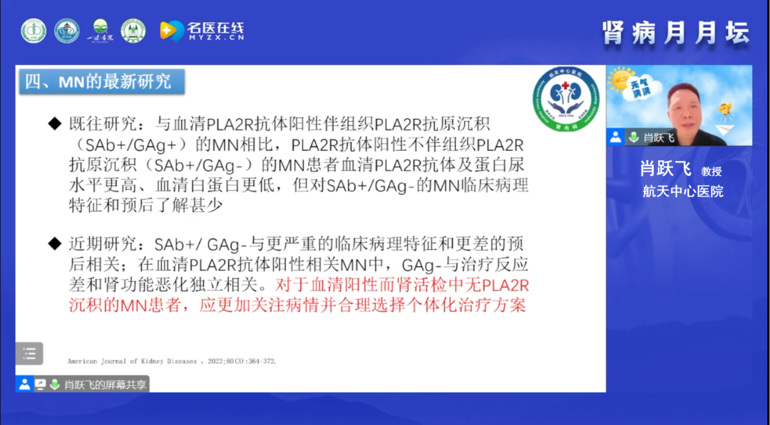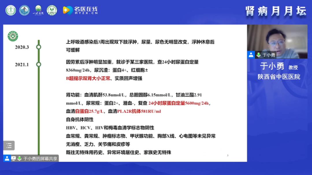 于小勇教授在線分享了一例特殊的抗PLA2R抗體介導(dǎo)的膜性腎病。于教授詳細(xì)介紹了患者的診治經(jīng)過及隨訪情況,該患者是一名24歲的年輕男性,甘肅人,間斷性雙下肢浮腫2年余,因勞累后加重而入院,復(fù)查24小時(shí)尿蛋白定量 5.6g/24h、血清白蛋白 25.7g/L、血抗PLA2R抗體 581RU/mL,同時(shí)于教授也進(jìn)行了其他可能繼發(fā)性因素的排查,并以甘肅本地腫瘤發(fā)病率高低為依據(jù)進(jìn)行了腫瘤的排查,上述結(jié)果均未見異常。初步診斷為腎病綜合征、PLA2R抗體介導(dǎo)的膜性腎病,在追加病理檢測后,修訂診斷為原發(fā)性腎病綜合征、PLA2R抗體介導(dǎo)的膜性腎?。↖I-III期)。隨后,以指南建議為依據(jù)進(jìn)行了規(guī)范治療,血清學(xué)標(biāo)志物變化出現(xiàn)非常罕見現(xiàn)象:Scr、ALB和24h尿蛋白都在轉(zhuǎn)好,而抗PLA2R抗體的水平在經(jīng)歷前期一次下降后,轉(zhuǎn)而開始攀升未再下降,最后一次檢測結(jié)果24h尿蛋白為0.15g/24h、抗PLA2R抗體為221.1RU/mL,隨訪時(shí)患者自我感覺良好。于教授拋出以下幾點(diǎn)思考:MN是否均應(yīng)該依據(jù)高抗體滴度啟動(dòng)免疫治療?某些情況下是否動(dòng)態(tài)監(jiān)測,讓子彈再飛一會(huì)?患者臨床緩解,免疫學(xué)尚未緩解的原因是什么?隨后,于教授帶著問題進(jìn)行了精彩的文獻(xiàn)復(fù)習(xí)與回顧,為問題真相的揭示給出了更多的探索方向。