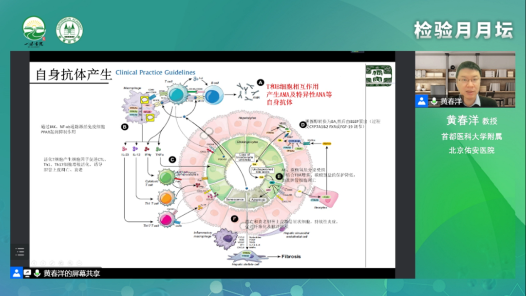 學術分享環節的最后,黃春洋教授指出自身抗體在自身免疫性肝病的診斷及預后判斷的作用。本次會議的講題就是從自身抗體的角度來看一下PBC有哪些疾病特點。主要分享從PBC自身抗體的產生、PBC自身抗體的分布以及不同自身抗體陽性PBC的特點三大部分展開。首先黃教授對PBC疾病的定義以及自身抗體產生的機制進行了簡要的介紹,他指出PBC是一種由自身免疫反應介導、慢性的、進行性膽汁淤積性肝病。PBC的臨床特點包括膽汁淤積、相關自身抗體陽性及特征性的肝臟病理變化。黃教授對自身抗體做了大篇幅地講解。自身抗體的產生基因及環境等因素相關,免疫耐受打破。隨后,黃教授又利用多篇研究數據介紹了自身抗體檢測體對PBC診斷及病情預后判斷的作用。他強調,抗線粒體抗體(AMA),它是PBC的血清學診斷標志,其M2亞型診斷PBC的靈敏度和特異度高達95%以上,但也可以出現在其他肝病患者,多表現為低滴度自身抗體。除此之外,黃教授又結合自身多年的臨床實踐經驗,對抗著絲點抗體(ACA)、抗210抗體等ANA特異性檢測指標在PBC中的預后及診療價值一一進行了詳細地介紹。最后,黃春洋教授對上述自身抗體在PBC診療過程中的作用進行了總結。