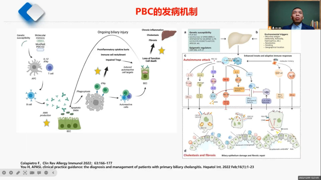 仲教授接著介紹了PBC相關自身抗體,介紹了第一類抗體如AMA和AMA M2的核型、相關抗原及對應相關疾病。第二類抗體如核膜型的抗gp210抗體、核點型的抗sp100抗體、著絲點型的抗CENP抗體都與PBC相關。通過蛋白組分的技術檢測到抗KLHL12和HK1抗體在AMA陰性的患者中檢測率高達50%。仲教授還介紹PBC病因學主要有基因組學、表觀遺傳、環境因素等相關內容。最后分享了3例PBC病例報道,包括PBC診斷不及時的老人、罕見兒童PBC、新冠mRNA疫苗誘發急性自身免疫樣肝炎伴非典型AMA和ANA。