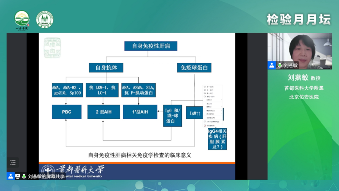 接著,劉燕敏教授為我們介紹了自身抗體的概念、簡介。自身抗體是診斷自身免疫性肝病重要指標,一些非特異性自身抗體也可以出現在其他肝病中。肝臟疾病合并自身抗體陽性有三種情況:自身免疫性肝病、其他原因肝病合并自身免疫性肝病以及非自身免疫性肝病伴免疫現象。劉教授就這三種情況各自展開介紹。先介紹了自身免疫性肝病的分類、相關免疫學檢查的臨床意義、自免肝相關抗體及其臨床意義、原發性膽汁性膽管炎相關抗體及其臨床意義,劉教授指出自身抗體是診斷自身免疫性肝病的主要特征之一,但不是所有的自身抗體陽性伴肝功異常都診斷自身免疫性肝病。接下來劉教授講述了其他原因肝病合并自身免疫性肝病,如病毒性肝炎合并自身免疫性肝病,介紹了病毒性肝炎的病毒性指標,指出慢性病毒性感染合并自身免疫性肝病常難以識別和確診,容易造成延誤診斷。對于病毒性肝炎合并AIH的患者,AIH的診斷往往落后于病毒性肝炎,AIH的最終診斷應基于血清學特征、組織學發現、評分系統、治療反應和結果。與單純PBC患者相比,合并HCV感染的PBC患者更容易并發肝癌,PBC合并HCV感染的患者比合并HBV感染的患者更容易發生肝硬化,且預后較差。劉教授還列舉了幾個臨床案例向我們展示了其他原因肝病合并自身免疫性肝病的臨床特點、臨床診治過程。最后劉教授介紹了非自身免疫性肝病伴免疫現象。對非自身免疫性肝病伴免疫現象,需鑒別HCV感染、藥物性肝損傷、非酒精性脂肪性肝病、Wilson病。