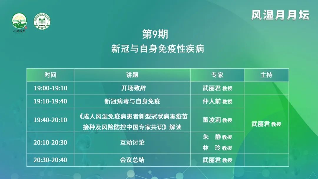 作為本次會議的大會主席,武麗君教授首先表示非常高興與各位專家一起在線上相見,參與一味書院舉辦的風濕月月壇。通過本次論壇共同學習感染新冠病毒后機體自身抗體的變化,探討新冠病毒與自身免疫性疾病相關的話題,能夠將前沿的理論知識和寶貴的實際經驗,更好為應用和服務于臨床實際工作中。