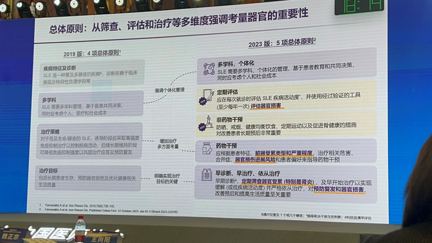 2023年EULAR SLE管理建議解讀中,楊娉婷教授指出SLE管理的總體原則是從篩查、評估和治療等多維度強調考量器官的重要性。建議應在每次就診時評估SLE疾病活動度,并使用經過驗證的工具,至少每年一次評估器官損害。SLE以腎臟受累最為常見,需引起足夠的重視。實現治療目標的關鍵是早診斷、定期篩查器官受累,及早開始治療以實現緩解并嚴格依從性治療,這對預防復發和器官損害、改善預后和提高患者生活質量至關重要。