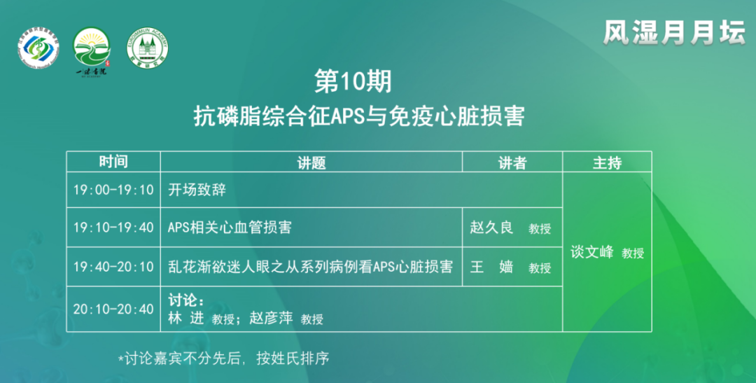 談文峰教授首先表示非常高興與各位同道、各位專家線上相見(jiàn),參與到本次風(fēng)濕月月壇中,本期的主題是“抗磷脂綜合征APS與免疫心臟損害”。很榮幸,今天邀請(qǐng)到了兩位專家作為授課嘉賓及兩位討論嘉賓。APS和心肌/心臟損害,大家關(guān)注得并不多,希望通過(guò)本次會(huì)議,可以拓展大家的思維,收獲新的認(rèn)識(shí)。
