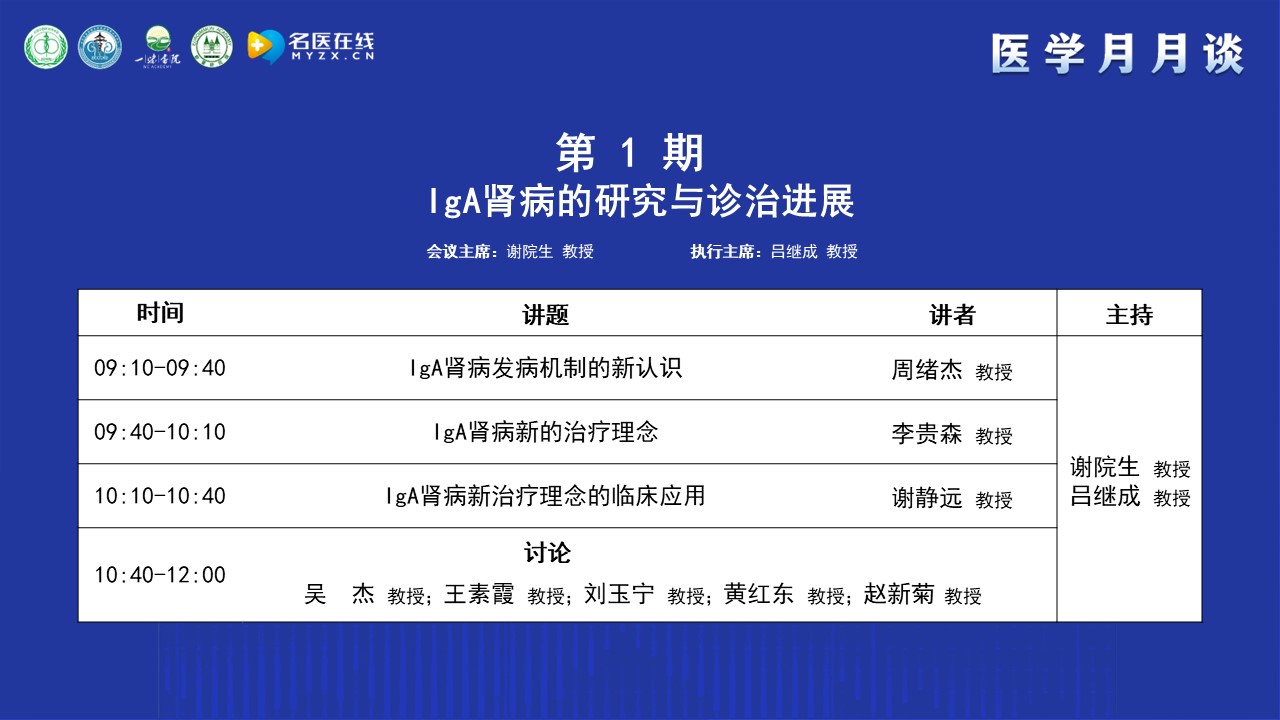 謝教授簡單介紹了“醫學月月談”的前身“腎病月月壇”的歷史,“腎病月月壇”是在疫情防控期間開展的線上學術交流活動,以腎臟病或系統性疾病腎損害的診治為主,每期一個主題,每期參會人數在1.8萬左右,為了讓更多的人受益,升級為“醫學月月談”。