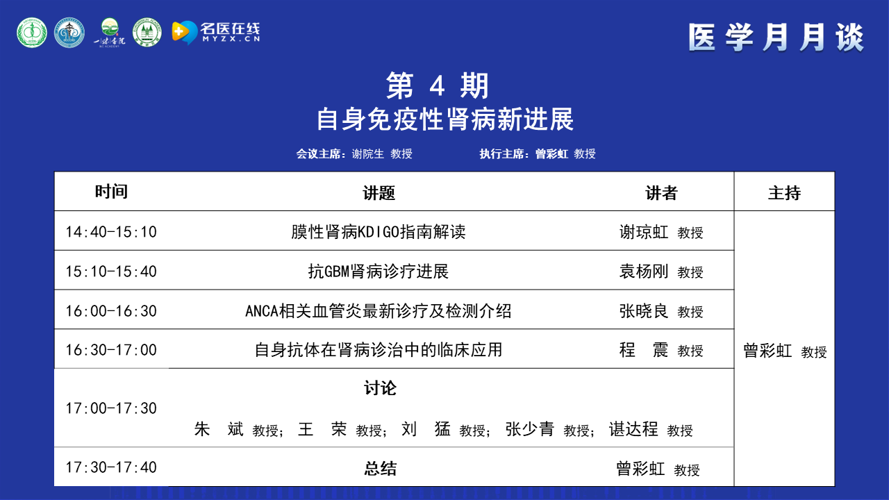 首先感謝謝院生教授精心組織醫(yī)學(xué)月月談,其次感謝四位講者為本次論壇做的精心準(zhǔn)備。本次論壇四位講者對(duì)膜性腎病、抗GBM病、ANCA相關(guān)血管炎及自身抗體在足細(xì)胞病中的應(yīng)用進(jìn)行了發(fā)病機(jī)制、診斷、治療的介紹,五位討論嘉賓對(duì)講者的內(nèi)容提出了自己的觀點(diǎn),同時(shí)也對(duì)臨床上存在的問題和講者之間進(jìn)行了討論和交流。目前醫(yī)學(xué)月月談系列活動(dòng)共進(jìn)行了30多期,期盼后面的內(nèi)容更加精彩。