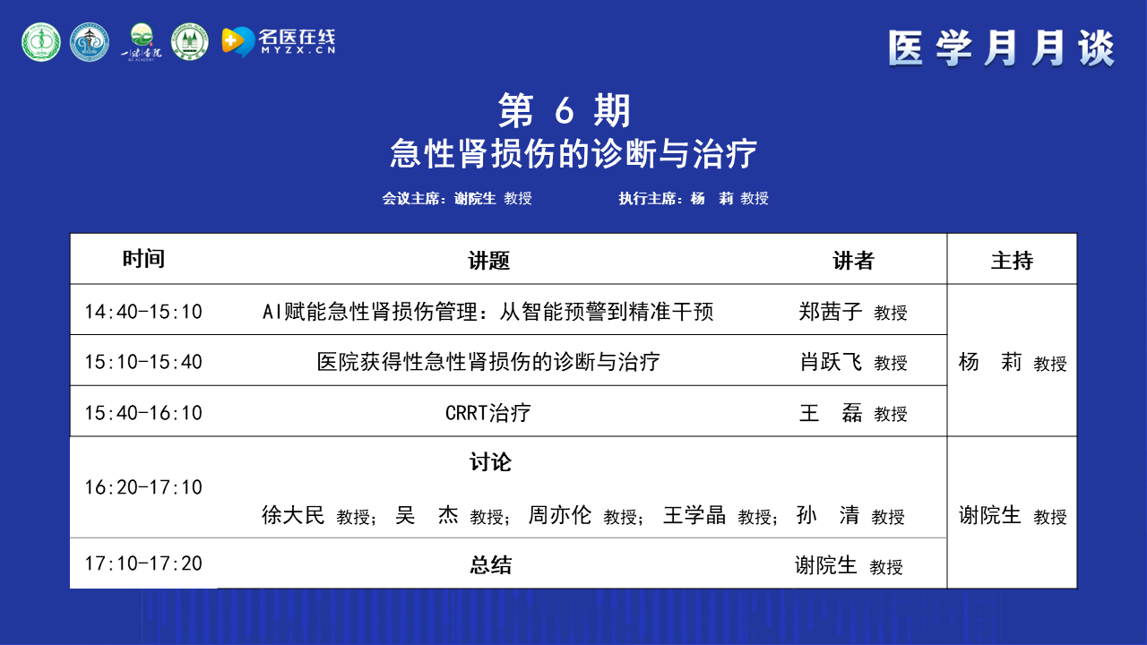 2025年6月28日,由北京中西醫(yī)結(jié)合學(xué)會(huì)舉辦的《醫(yī)學(xué)月月談(第6期)——急性腎損傷的診斷與治療》于線下(北京)和線上同步舉行。本次論壇由北京中西醫(yī)結(jié)合學(xué)會(huì)腎臟病專業(yè)委員會(huì)主任委員、北京中西醫(yī)結(jié)合腎臟疑難病會(huì)診中心主任、北京大學(xué)航天中心醫(yī)院腎內(nèi)科主任醫(yī)師特聘教授、解放軍總醫(yī)院及南開大學(xué)醫(yī)學(xué)院博士生導(dǎo)師謝院生教授擔(dān)任大會(huì)主席,北京大學(xué)第一醫(yī)院楊莉教授擔(dān)任大會(huì)執(zhí)行主席,北京大學(xué)第一醫(yī)院鄭茜子教授、航天中心醫(yī)院肖躍飛教授、北京大學(xué)人民醫(yī)院王磊教授作為講課嘉賓,北京大學(xué)第一醫(yī)院徐大民教授、解放軍總醫(yī)院第一醫(yī)學(xué)中心吳杰教授、首都醫(yī)科大學(xué)附屬北京天壇醫(yī)院周亦倫教授、民航總醫(yī)院王學(xué)晶教授、青島大學(xué)醫(yī)學(xué)院附屬青島市婦女兒童醫(yī)院孫清教授作為本次大會(huì)的討論嘉賓。