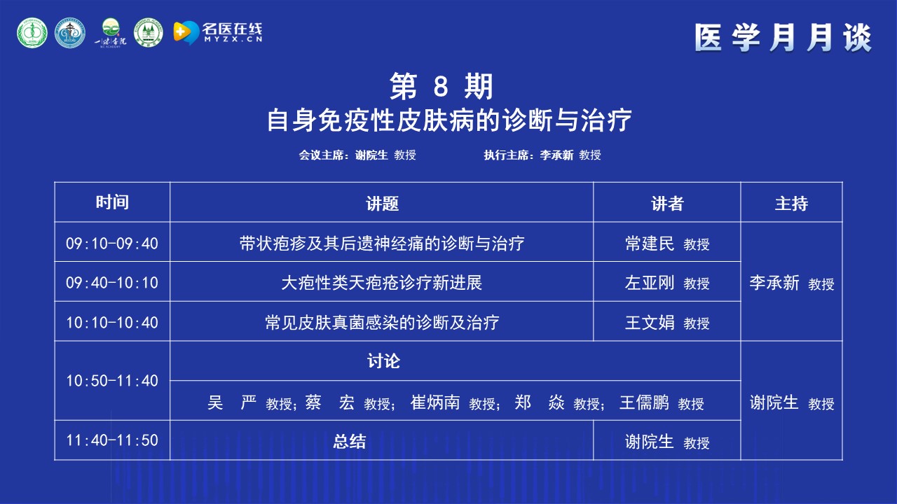 謝教授簡單介紹了“醫(yī)學月月談”的前身“腎病月月壇”的歷史,“腎病月月壇”是在疫情防控期間開展的線上學術交流活動,以腎臟病或系統(tǒng)性疾病腎損害的診治為主,每期一個主題,形式和內(nèi)容都很受歡迎。為了讓更多的人受益,升級為“醫(yī)學月月談”。“醫(yī)學月月談”是一個以臨床需求為導向、以解決臨床問題為目的、線下和線上相結(jié)合的醫(yī)學交流活動。本期醫(yī)學月月談的主題是自身免疫性皮膚病的診斷與治療,之所以選擇這個專題,主要基于兩點考慮:其一,"醫(yī)學月月談"始終秉持跨學科理念,涵蓋腎科、皮膚科、風濕免疫科等多領域;其二,腎病患者普遍存在免疫力低下問題,尤其在應用激素和免疫抑制劑后,易并發(fā)帶狀皰疹、皮膚真菌感染、大皰性皮膚病等,這些并發(fā)癥嚴重影響患者生活質(zhì)量和預后。因此,本期特別邀請到在自身免疫性皮膚病研究領域非常著名的李承新教授作為本期的執(zhí)行主席,相信本期月月談在李教授的引導下,在各位專家們的大力支持下,取得圓滿成功。