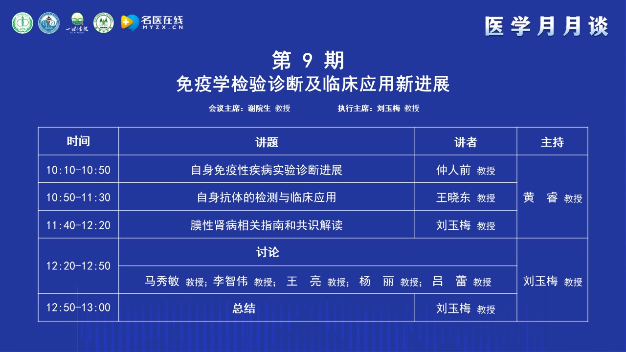 謝教授簡單介紹了“醫(yī)學月月談”的前身“腎病月月壇”的歷史,“腎病月月壇”是在疫情防控期間開展的線上學術交流活動,以腎臟病或系統(tǒng)性疾病腎損害的診治為主,每期一個主題,形式和內容都很受歡迎。為了讓更多的人受益,升級為“醫(yī)學月月談”。“醫(yī)學月月談”秉承“腎病月月壇”的優(yōu)良傳統(tǒng),聚焦醫(yī)學工作的熱點和難點,以臨床需求為導向,以解決臨床問題為目的,每月主辦1-2次線下和線上相結合的醫(yī)學交流活動,線下在全國的城市輪流舉辦,已相繼在北京、沈陽、上海、南京、武漢、福州等地成功舉辦8期醫(yī)學月月談。本期醫(yī)學月月談的主題是免疫學檢驗診斷及臨床應用新進展,非常榮幸的邀請到新疆維吾爾自治區(qū)中醫(yī)醫(yī)院檢驗科主任劉玉梅教授作為本期的執(zhí)行主席,相信本期月月談將在劉教授的引導下,在各位專家們的大力支持下,取得圓滿成功。