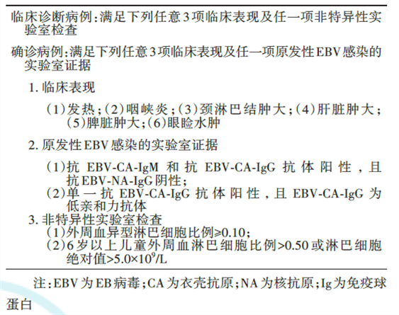 IM的診斷依據包括臨床表現、原發性EBV感染的實驗室證據和非特異性實驗室檢查(表1)。臨床診斷病例需滿足臨床表現中任意3項及非特異性實驗室檢查中任意1項,確診病例需滿足臨床表現中任意3項及原發性EBV感染的實驗室證據中任意1項。
