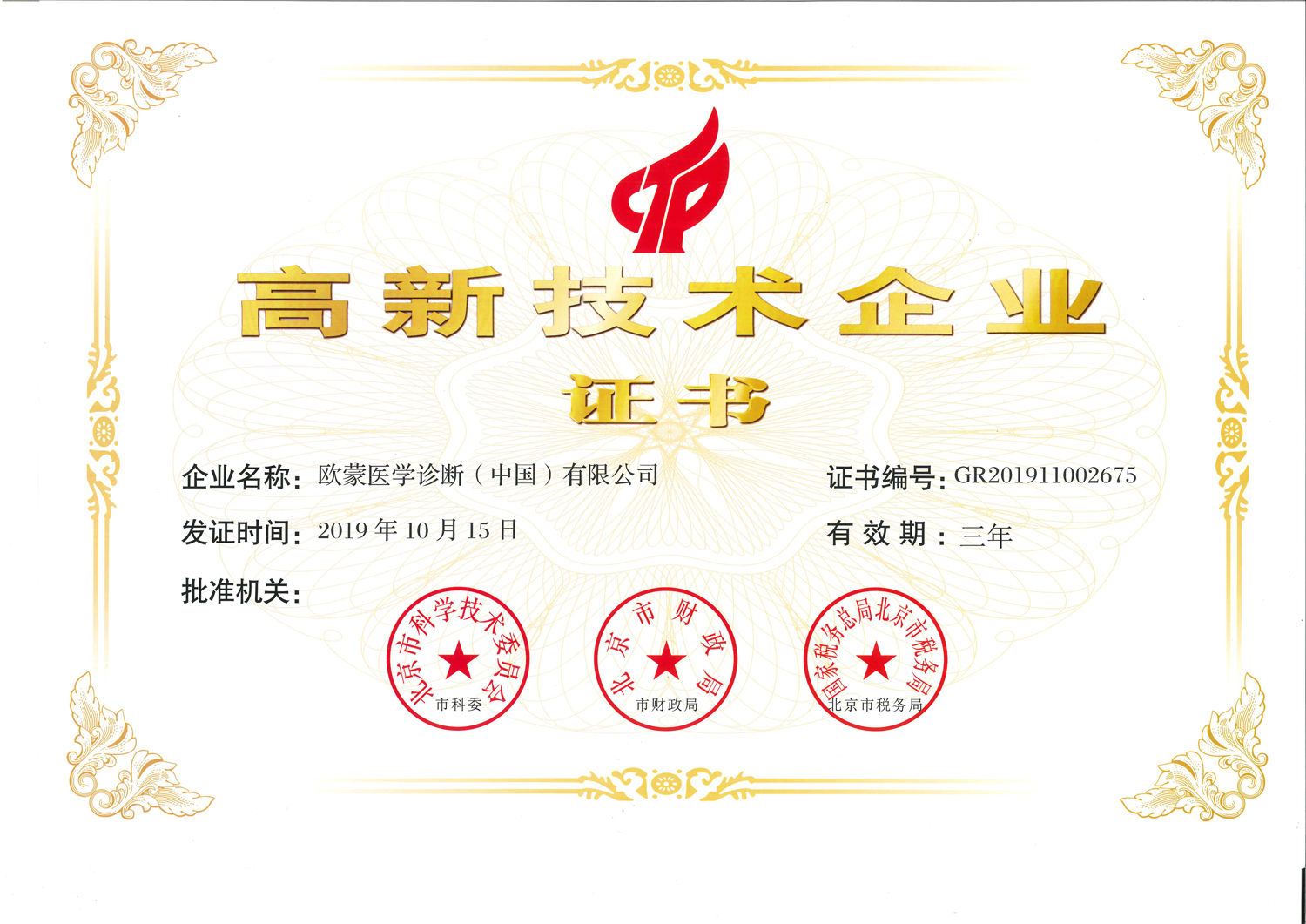依據科技部、財政部、國家稅務總局《高新技術企業認定管理辦法》、《高新技術企業認定管理工作指引》等相關規定,歐蒙醫學自2016年首次獲得國家高新技術企業資格認定以來,于今年10月通過了國家高新技術企業資格復審。這標志著企業三年來取得的一系列發展業績及科研成果、創新卓越完善的科研體系、積極進取高素質的研發團隊等再次得到北京市級相關部門的肯定與認可。